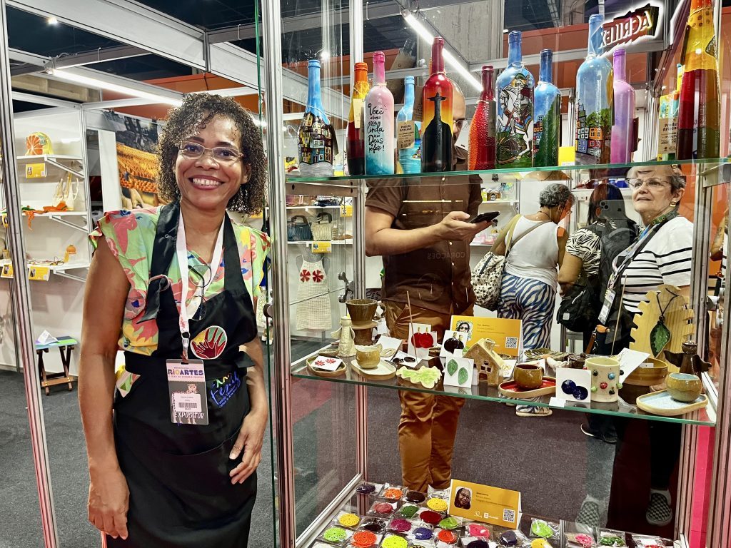 Artesã Dalva dos Santos e suas peças no estande da Fenig Nova Iguaçu